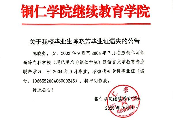 关于beat365毕业生陈晓芳毕业证遗失的公告
