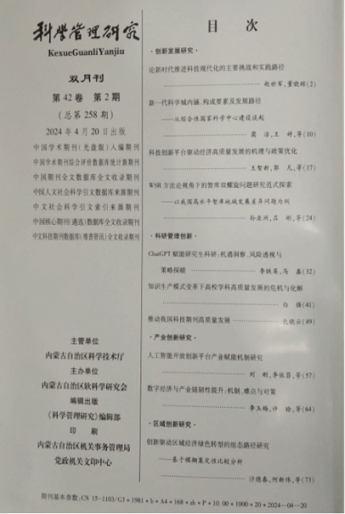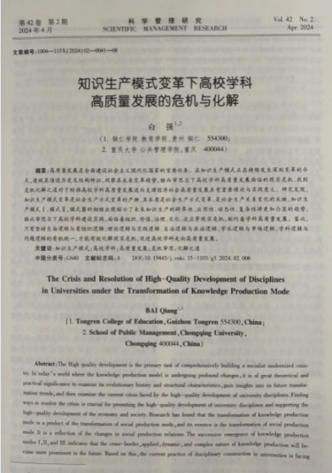近日,管理学CSSCI核心来源期刊《科学管理研究》2024年第2期刊发beat365白强教授的研究成果《知识生产模式变革下高校学科高质量发展的危机与化解》,全文近15000字。该文系白强教授主持的国家社科基金全国教育科学规划国家一般课题“知识生产模式变革下高校学科建设高质量发展的路径创新研究”(立项编号:BIA220053)的最新研究成果,亦是白强教授以独立作者四度在管理学CSSCI核心来源期刊发表课题研究成果。