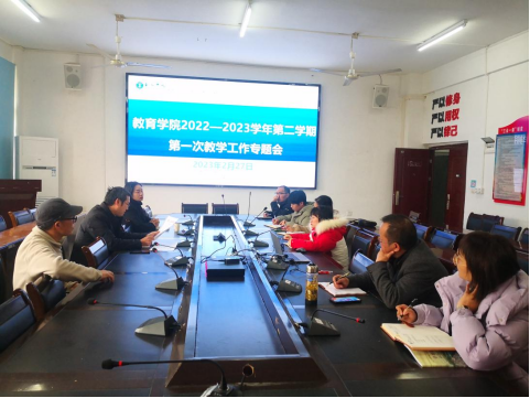 为明确我院新学期教学工作重点,规范教学管理,提升教学质量,2023年2月27日下午,在明理楼B教育学院三楼会议室召开了2022-2023学年第二学期第一次教学工作专题会。教育学院副院长王华刚、各系主任及各教研室主任、各专业负责人、教务科部分老师参加了此次会议,会议由教务科负责人陆艳博士主持。