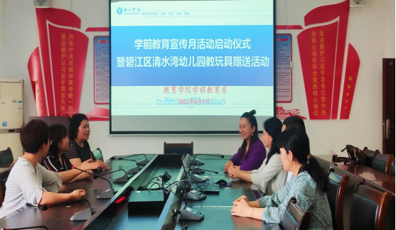 为扎实做好第11个全国学前教育宣传月工作,推进我院学前教育专业对幼儿园幼小衔接工作的指导,2022年6月7日,我院在三楼会议室开展了“幼小衔接,我们在行动!”2022学前教育宣传月活动启动仪式暨铜仁市碧江区清水湾幼儿园玩教具赠送活动。活动由学前教育系系主任杨瑛主持,碧江区清水湾幼儿园园长杨晓旭、教育学院副院长田劲松、学前教育教研室主任杨松慧、专业负责人熊瑛、专业课程老师胡树斌、李娜出席此次活动。