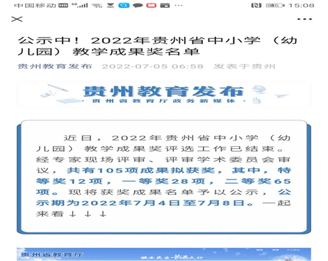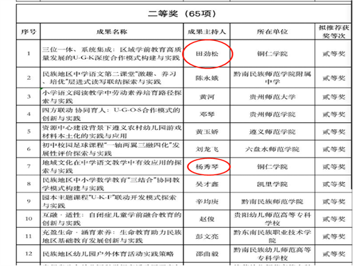 近日,贵州省中小学(幼儿园)教学成果奖评审结果揭晓。教育学院田劲松团队的教学成果《三位一体、系统集成:区域学前教育高质量发展的U-G-K深度合作模式构建与实践》和杨秀琴团队的教学成果《地域文化在中学语文教学中有效应用的探索与实践》分别荣获二等奖。