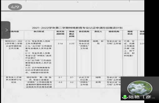 在本学期专业认证工作推进方案研讨会上,陆艳博士首先以特殊教育专业负责人的身份汇报了“特殊教育专业认证申请阶段工作推进计划”。接着,学前教育专业负责人熊瑛博士汇报了“学前教育专业认证整改工作推进计划”,小学教育专业负责人田圣会博士汇报了“小学教育专业认证工作推进计划”。针对三个专业的认证工作计划,参会教师纷纷发表了自己的看法,田劲松副院长提出各专业的认证工作推进计划需进一步完善,要做到每项工作都责任到人,这样才有利于今后有效地开展。