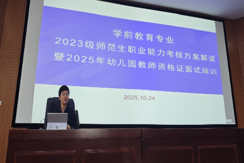 为帮助2023级学生明晰职业发展路径,打通从校园到职场的关键环节。近日,教育学院学前教育专业于博思楼101教室成功举办“师范生职业能力考核方案解读暨2025年幼儿园教师资格证面试培训会”。本次会议面向2023级全体学生,培训会由杨瑛、杨松慧、胡天龙三位老师主讲。