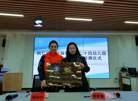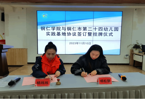 为了更好地加强高校与幼儿园的沟通合作,构建协同育人机制,提升学生的实践教学能力,我院学前教育专业于11月10日与铜仁市第二十四幼儿园进行了实践教学基地协议签订及授牌仪式。学前教育专业教研室主任杨松慧老师代表铜仁学院和铜仁市第二十四幼儿园签订了教育实践基地协议书,并进行了授牌,铜仁市第二十四幼儿园园长杨玮玮及部分教职员工参加本次授牌仪式。