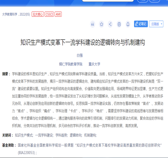 该文章系白强教授主持的国家社科基金教育学国家一般课题“知识生产模式变革下高校学科建设高质量发展的路径创新研究”(立项编号:BIA220053)的研究成果之一。成果在深入分析知识生产模式深刻变革下学科发展趋势的基础上,揭示了一流学科建设的逻辑走向,提出了推动一流学科高质量发展的机制建议,为我国新一轮“双一流”建设提供了新的洞见,受到学界重视和关注。
