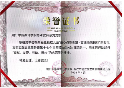 下午,教育学院特殊教育系党支部与铜仁宏昕康新中医医院开展了“爱心点燃希望·志愿助残铜行”新时代文明实践志愿服务活动。教育学院2022级、2023级特殊教育专业学生献上了精彩纷呈的节目,同时为参会师生与家长系上了代表关爱孤独症儿童的蓝丝带,并同孤独症儿童及家长们进行了有效互动。同时,党员代表陆艳同志接受了铜仁宏昕康新中医医院敬赠的beat365英国官方网站教育学院特殊教育系党支部志愿服务荣誉证书。
