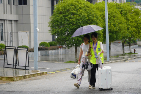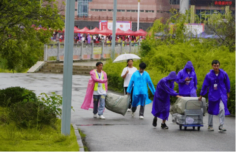 志愿者们忙碌地穿梭在校园中,有的抬着沉重的行李箱,有的拎着笨重的包裹,还有的手里拿着伞为新生和家长们遮风挡雨。他们一边不停地来回搬运,一边仔细为新生解答疑问,汗水和雨水交织在一起,脸上却洋溢着不知疲倦的笑容。他们用行动诠释着“奉献、友爱、互助、进步”的志愿者精神,为新同学们传达出特别的关爱与温暖。