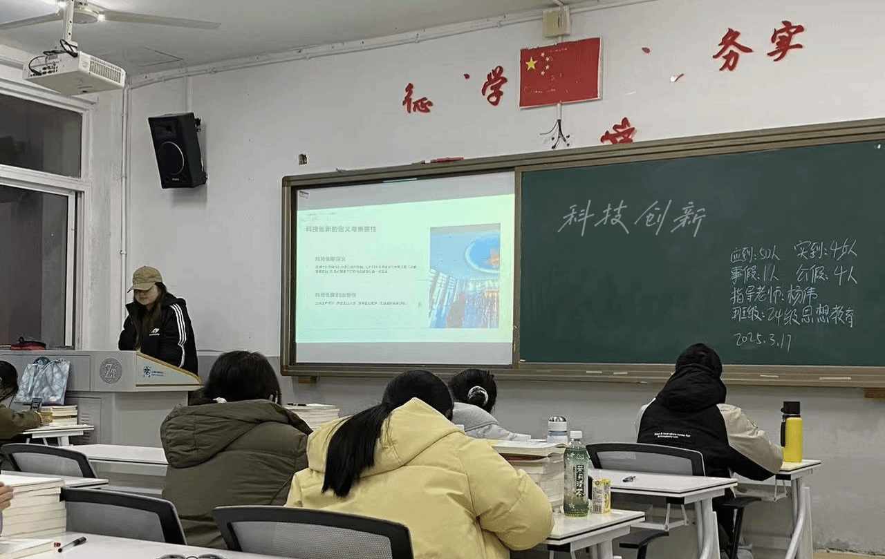 首先,各班主讲人通过视频展示中国在人工智能、科技产业等方面的最新成果,让同学们深刻感受到科技创新对生活和社会发展的巨大影响。 同时,学习了《人民日报》对中国科技创新成就的肯定报道,深切感受到了创新精神的伟大力量。其次,主讲人讲述了中华优秀传统文化、革命文化和社会主义先进文化的相关内容,还播放电影《哪吒之魔童降世》片段,让学生们领略到了传统文化与现代科技的完美融合,进一步增强了民族自豪感和文化认同感。紧接着,主讲人强调今年是遵义会议召开的90周年,通过讲述红军长征的英勇事迹和革命先烈的感人故事,鼓励同学们去参观各地革命遗址,了解更多的红色资源,把红色文化的种子播撒在心中,在新的长征路上继续奋勇前进。班会最后,主讲人对本次班会进行了总结,强调科技创新是时代发展的动力源泉,文化自信是民族精神的内核,遵义会议精神是砥砺前行的强大支撑。鼓励同学们在新时代背景下全面发展,勇担时代重任。