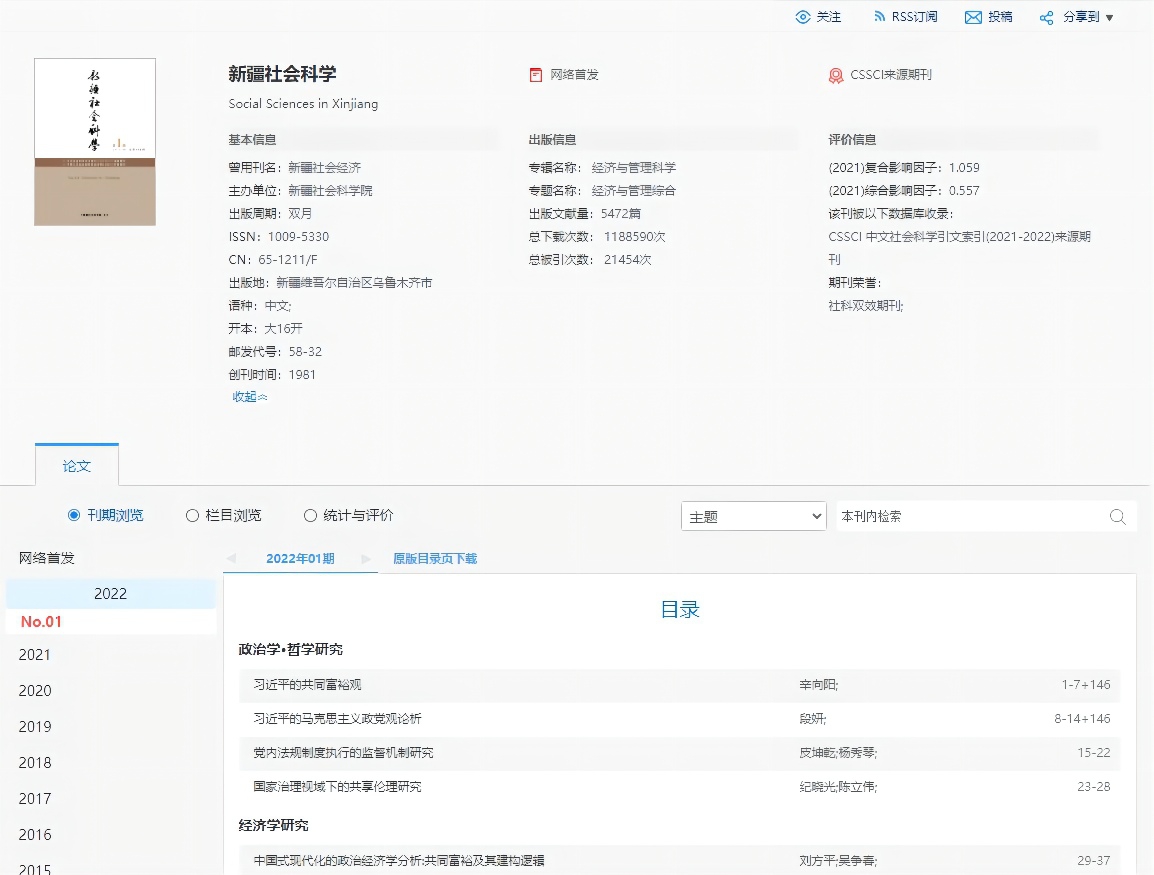 《新疆社会科学》(双月刊)创刊于1991年,是由新疆社会科学院主管、主办的综合性人文社会科学学术理论刊物,是CSSCI 中文社会科学引文索引(2021-2022)来源期刊。