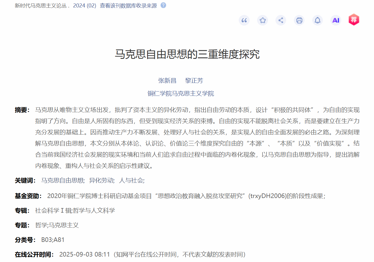 我院副院长张新昌副教授与2023级硕士研究生黎正芳撰写的论文“马克思自由思想的三重维度探究”在《新时代马克思主义论丛》2024年第2期发表。该研究从本体论、认识论和价值论三个维度系统阐释了马克思自由思想的深刻内涵,并结合经济社会发展的现实环境和人们追求自由过程中面临的内卷化现象,提出了消解内卷现象、重构人与社会关系的实践路径。