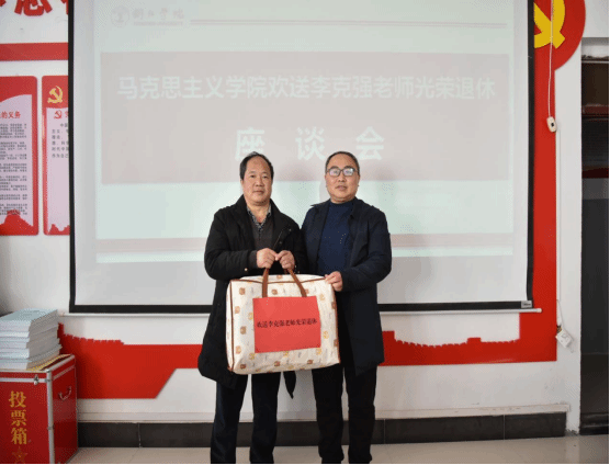 最后,院长汪漻对李克强老师的执教生涯及为教育所付出的心血给予了高度赞誉,对他多年来的辛勤劳动与无私奉献表示感谢,祝愿李老师的退休生活万事顺意、幸福美满!党委书记张江林代表学院为李克强老师送上了退休纪念品并与其合照留念,本次座谈会在一片温馨氛围里圆满落下帷幕。