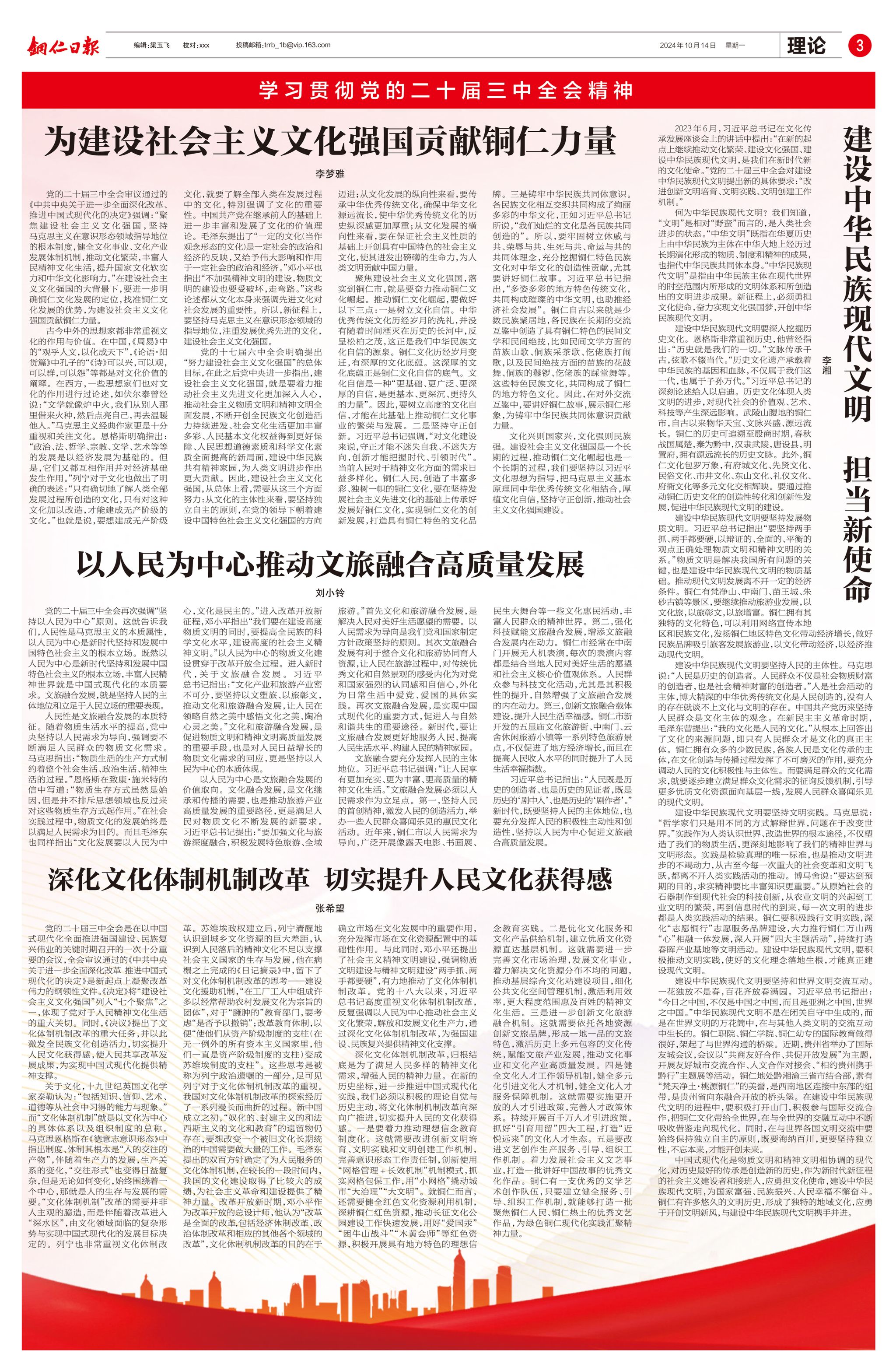 为深入学习贯彻党的二十届三中全会精神,扩大beat365马克思主义理论学科影响力,马克思主义理论一级学科硕士点充分发挥理论优势,在学科带头人侯长林教授的指导下,李梦雅、李湘、刘小玲、张希望4名研究生深入学习党的二十届三中全会精神和习近平文化思想,以“文化”为主题撰写4篇理论文章,于2024年10月14日在《铜仁日报》“学习贯彻党的二十届三中全会精神”理论专版发表。