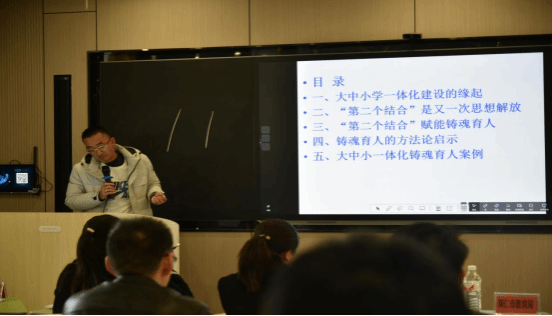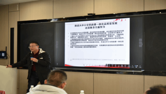 教育部“手拉手”集体备课中心(贵州)主任,贵州师范大学马克思主义学院研究院院长、博士生导师汪勇教授围绕“关于大中小学一体化探赜”主题,对与会人员进行了培训。他强调,思政课不同学段之间在教学理念、课程设置以及评价体系中存在着差异,尽管面临诸多挑战,但通过不断学习与适应,可有效促进大中小学思政课建设一体化进程。