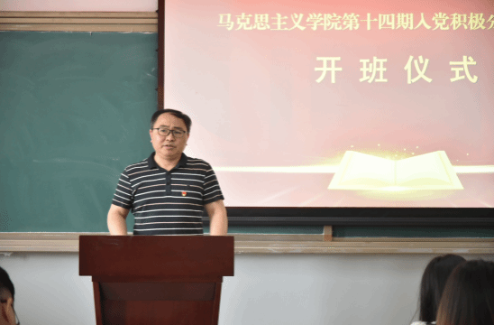 3月27日中午,我院第十四期入党积极分子培训班在依仁楼A204教室举行开班仪式。党委书记张江林出席并作动员讲话,党委副书记李兢作学习纪律要求,学生党支部书记杨学礼主持开班仪式。