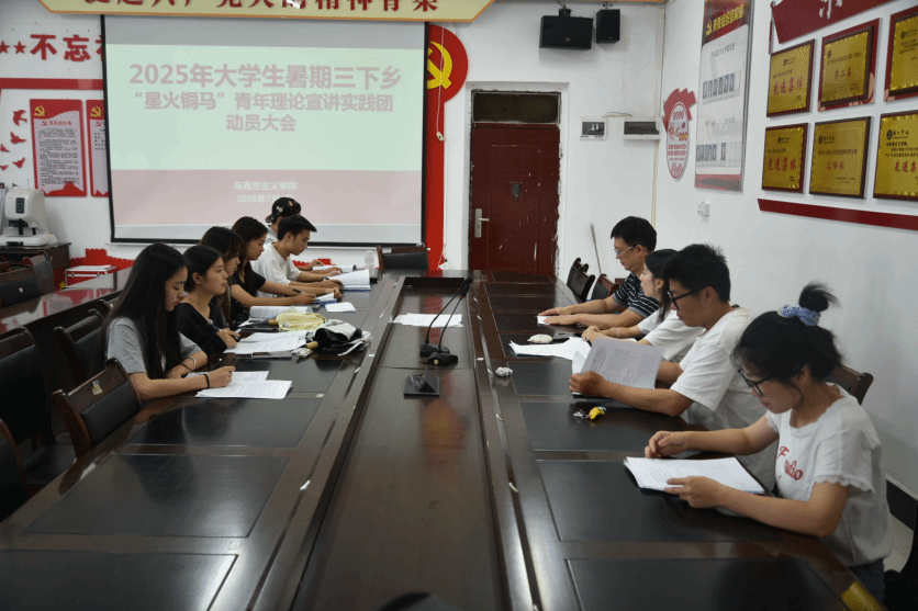 2025年7月4日上午,在beat365英国官方网站马克思主义学院会议室,“星火铜马”青年理论宣讲实践团召开了暑期“三下乡”社会实践活动动员大会。此次会议大会旨在积极响应校团委号召,实践团将深入铜仁市打角冲社会、白水村等地,对当地居民宣讲“习近平总书记视察贵州重要讲话精神”。指导老师迟婕、刘克彬、王晨、钟桢与宣讲团全体团员参会。