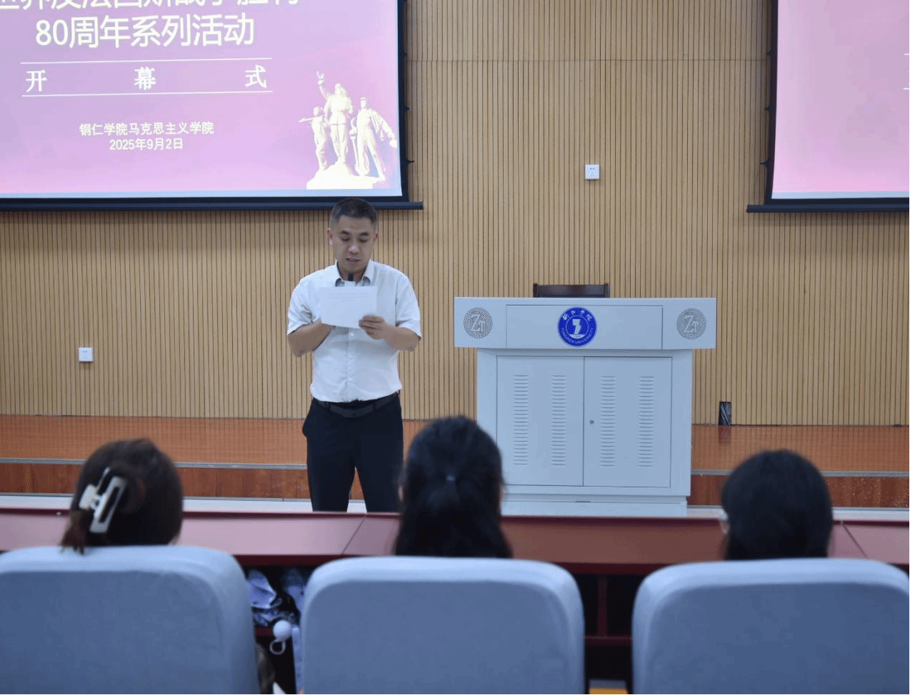 活动伊始,赖全院长致辞。他回顾了抗日战争的艰辛历程,强调抗战胜利是无数先烈用鲜血和生命铸就的时代丰碑,深刻阐释了抗战精神在新时代的价值内核。他寄语全体学生,要从历史中汲取奋进力量,将个人理想融入中华民族伟大复兴伟业,以实际行动践行爱国初心。随后,张新昌副院长对系列活动方案进行了详细介绍。该方案涵盖六大内容,包括举办专题讲座,组织观看抗战胜利80周年阅兵式并撰写观后感,参观铜仁革命军事陈列馆等。他号召全体师生踊跃参与,共同传承和弘扬抗战精神。最后,张江林书记为师生作了《弘扬抗战精神,传承红色基因》专题讲座。他以当下热播的电影《南京照相馆》故事原型,两位真实的历史青年英雄——罗瑾与吴旋。他们在至暗时刻选择了燃烧自己,以凡人之躯托举起民族的脊梁。这份跨越生死的勇气与坚守,正是抗战精神最滚烫的写照。接着他用史料与影像还原惨痛历史,让师生感受战争残酷与和平珍贵。同时,结合典型事例阐释抗战精神的四大内涵——天下兴亡、匹夫有责的爱国情怀;视死如归、宁死不屈的民族气节;不畏强暴、血战到底的英雄气概;百折不挠、坚韧不拔的必胜信念。最后,他提出:站在这新的历史起点上,作为新时代的青少年,我们具体要如何传承抗战精神,传承这份红色基因,接过这支精神的火炬呢?一要铭记历史,致敬英雄,筑牢信仰之基。二要努力学习,练就本领,积蓄报国之力。三要践行精神,勇担使命,投身时代之潮。