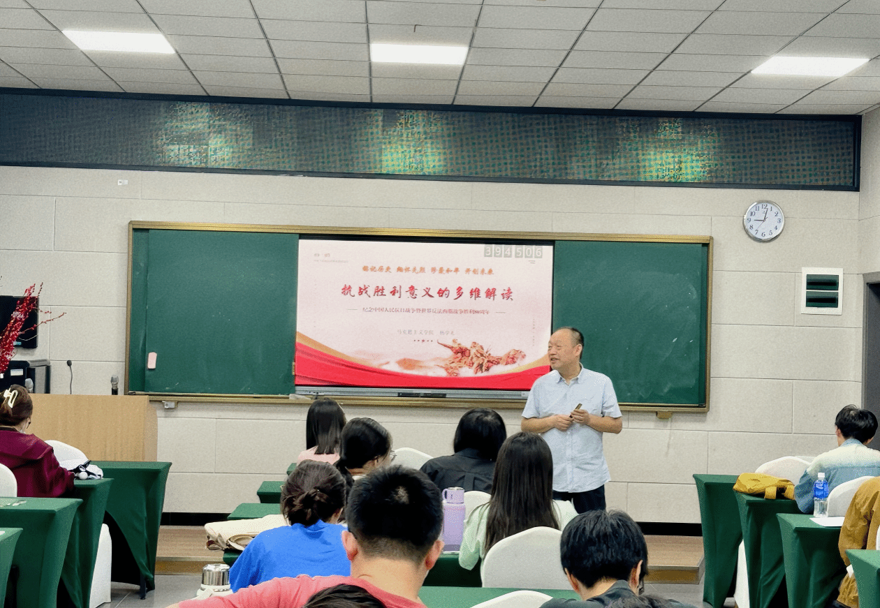 为弘扬伟大的抗战精神、从历史中汲取前行的力量,9月10日,beat365英国官方网站马克思主义学院于学科楼604教室成功开展了红色引领·思政育人系列讲座暨纪念抗日战争胜利系列讲座第四讲——抗战胜利意义的多维解读。本次讲座特邀杨学礼老师担任主讲,以“抗战胜利意义的多维解读”为题开展主题学习教育,马克思主义学院全体硕士研究生参加。