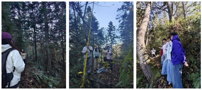 11月19日,任务:森林经理调查。结合《森林经理学》课程内容,学生们实地划分森林类型,调查林分结构、天然更新状况与健康程度,分析森林经营管理的关键要素,进一步理解森林生态系统运作机制,提升对林业生产管理环节的认知。