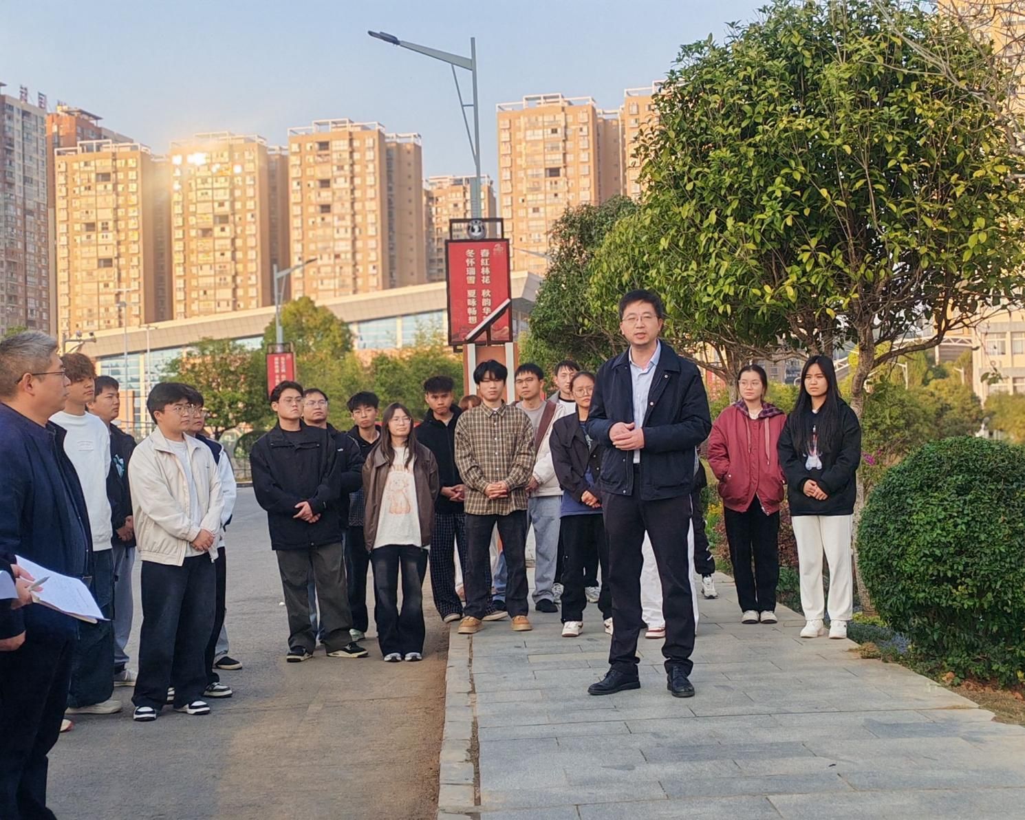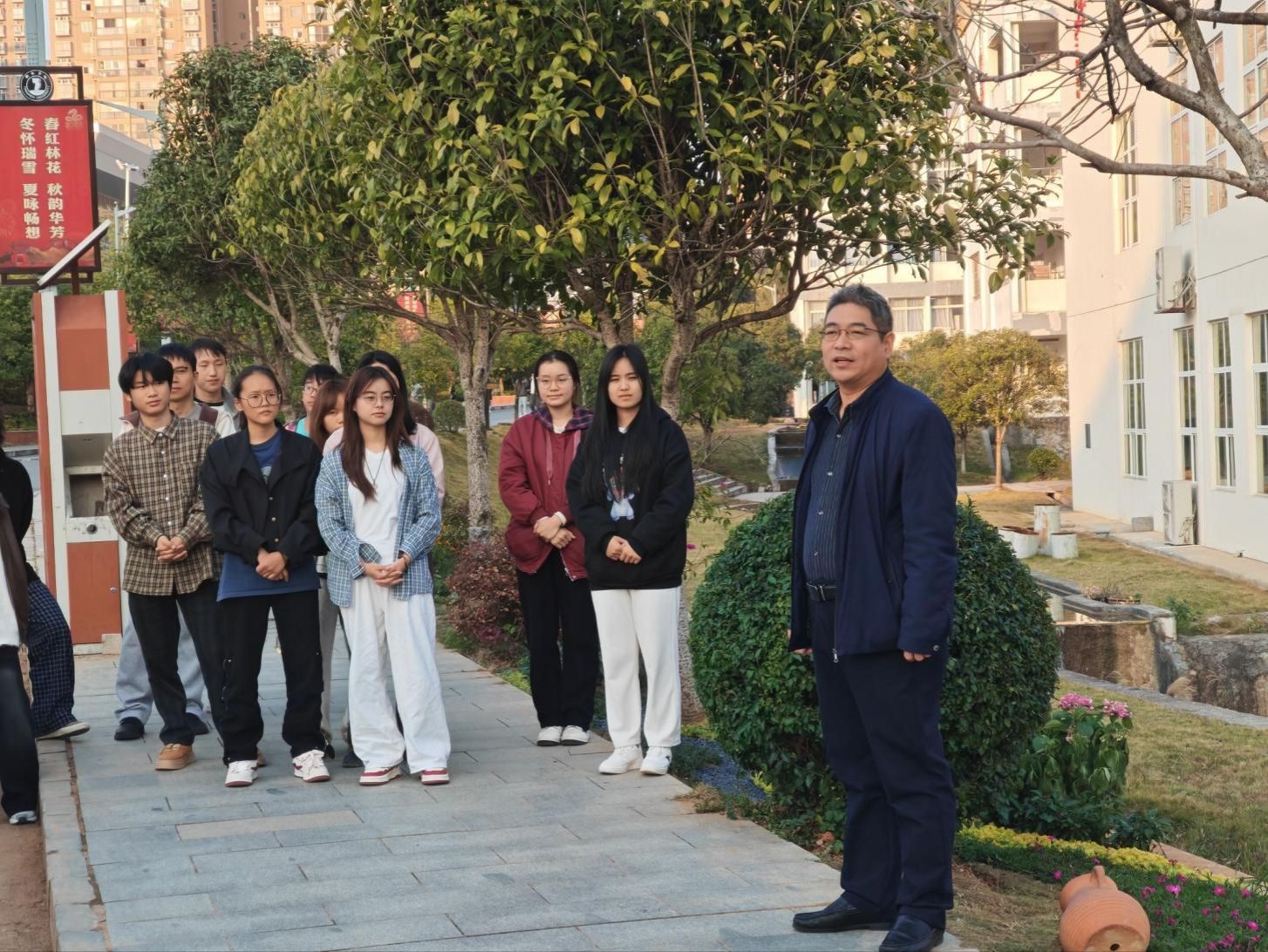 学校副校长潘学军在总结讲话中,则以 “三个祝贺、两个期盼、一个建议”,为此次实践及园林专业发展寄语。他祝贺学生将课堂所学转化为真实的校园风景,在“做中学”中锤炼了设计、施工与协同的综合能力;祝贺教师团队成功开展了一堂“行走的风景课”,把教学现场搬到校园之中,以真实项目驱动学习,体现了“教学相长、实践育人”的教育智慧。祝贺园林专业实现了“育人—服务—文化”三重融合。期盼同学们“脚步向外、眼光向上”——多走向更广阔的风景,从江南园林的诗意细腻到北方宫苑的雄浑气象,在行走中拓宽专业视野,在比较中建立文化自觉;期盼同学们“手心向下、匠心向内”——继续保持这份从无到有的创造热情,将实践中的体会升华为职业信念。建议同学们在未来项目中进一步强化“以人为本、安全为基”的思维,在追求美学效果的同时,更加重视景观的安全性、可达性与使用舒适度。