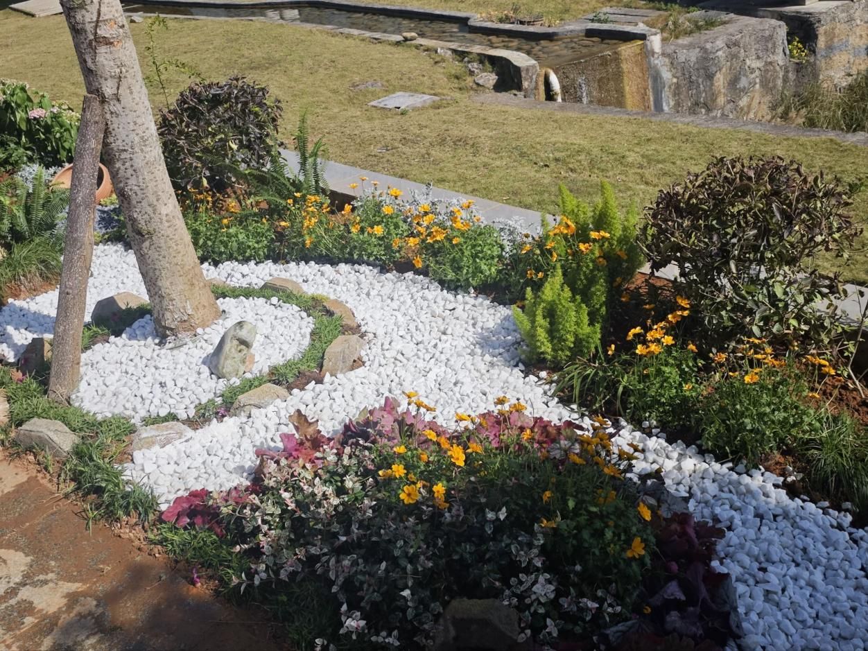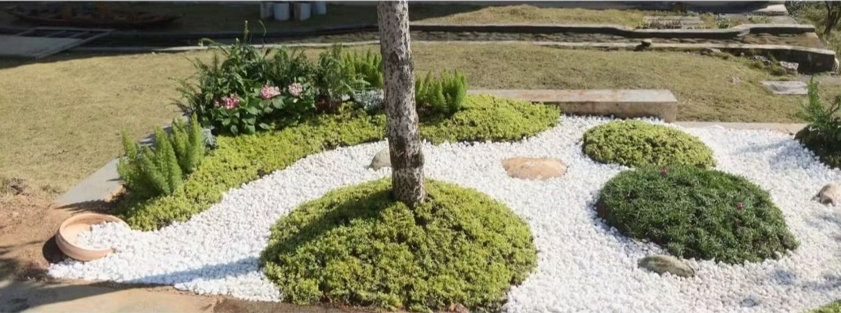 设计简介:以“自然织锦,轻氧节点”为主题,打造建筑旁的松弛感小景观。设计以乔木为核心骨架,用白色砾石模拟“流动织线”,搭配自然置石勾勒简洁基底;花境部分以绿色系植物为“锦缎底色”,点缀紫(矾根)、黄(金鸡菊)、银白(银叶菊)等色彩,如同织锦纹样自然散落。整体空间将“轻日式枯山水的写意”与“自然花境的生机”相融,既保留公共区域的整洁感,又以低维护植物营造出贴近自然的“轻氧角落”——观者驻足时,可在城市环境中短暂触摸自然质感,获得松弛的感官体验。