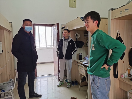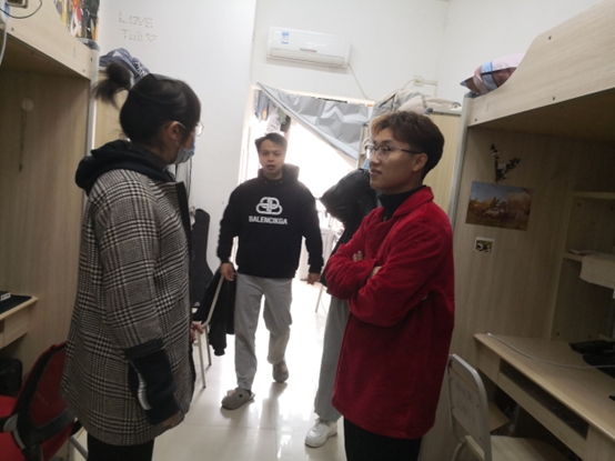 为贯彻落实党的二十大精神,把以人民为中心的发展思想落实到行动上,体现学校人文关怀,了解学生冬季公寓生活状况。12月15日,我院党委副书记蒋旭军、全体辅导员(班主任)一行深入学生寝室开展“暖冬行动”走访慰问活动。