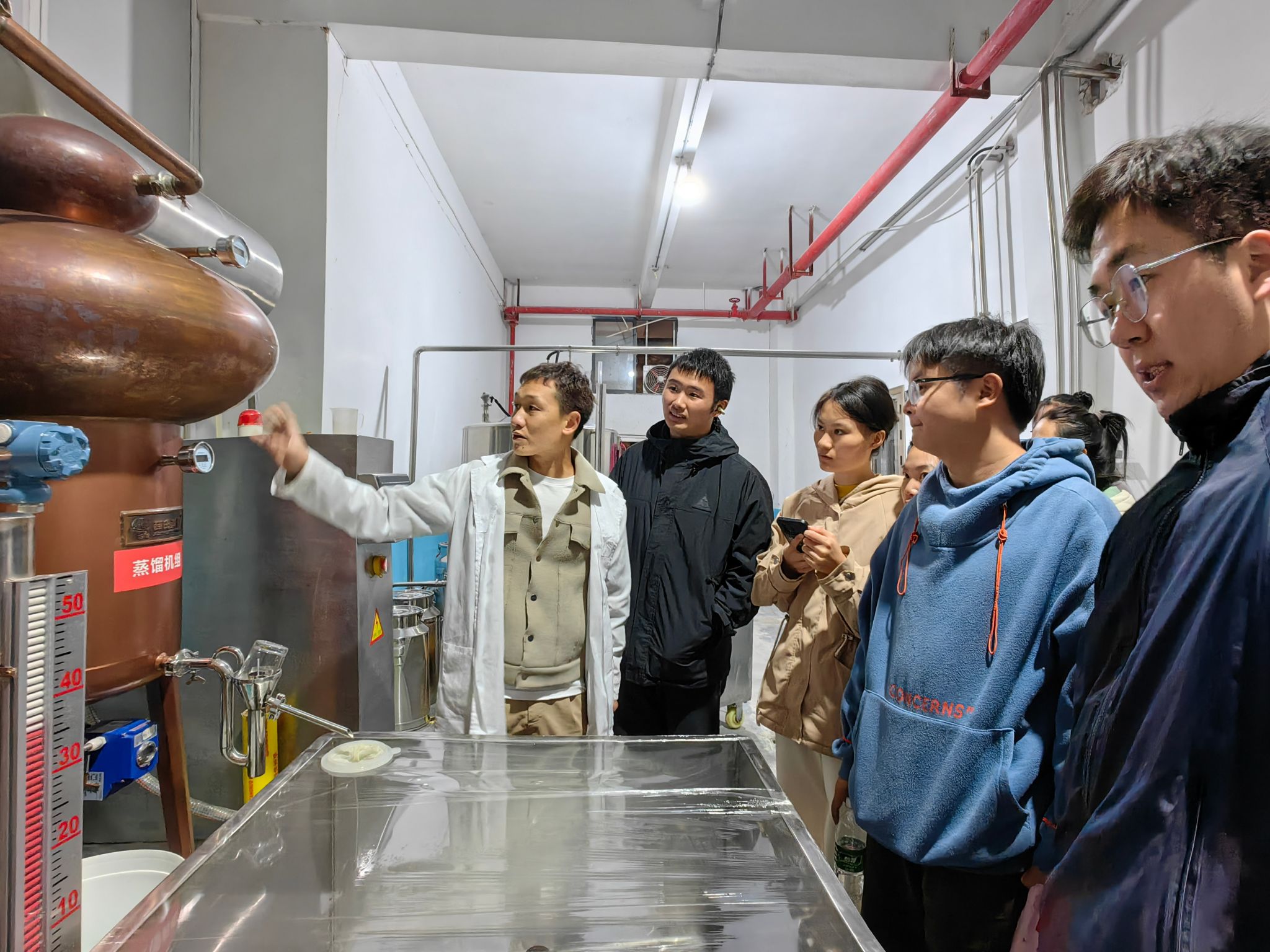 在碧江区小江口香柚种植基地,杨胜亮就香柚培育技术、种植技术及香柚产业对地方农民致富的带动作用进行详细的介绍,该基地采用了有机种植和绿色生产理念,注重土壤保护和生态平衡,激发了同学们对农业发展的兴趣。在贵州香柚香生态农业公司,费鹏对从果实的选择到果酒酿造的流程进行了介绍,该公司为金兰香柚苗木选育、种植、果酒加工基地,采用现代化设备,注重科技创新,确保果酒的品质和卫生安全;该公司带动当地农民增收致富,让同学们对果酒的加工生产有了全面的了解,加深了对企业及“龙头企业+合作社+农户”模式的理解。在松桃县正大镇万亩茶园,同学们对茶产业得采摘、加工技术及销售有了新的认识。通过参观调研,加强了校企校政合作,推进了产教融合,提高硕士研究生的培养质量。