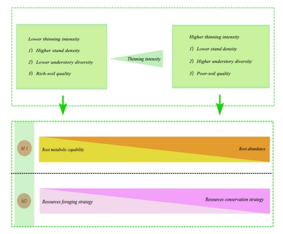 杉木细根适应间伐的策略示意图