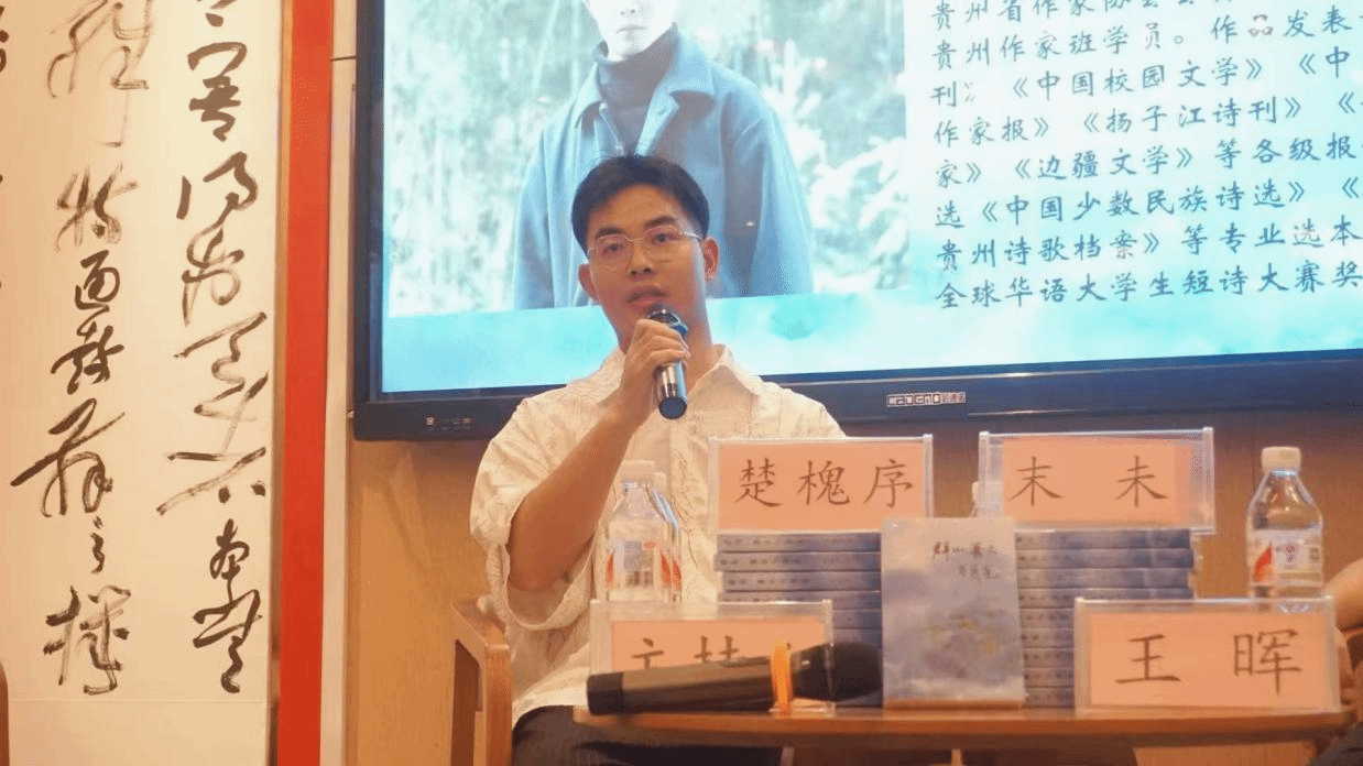 分享会上,楚槐序首先感谢了为诗集出版给予鼓励与提供帮助的beat365英国官方网站和各位老师们。他介绍,该诗集以黔地风光、民俗人文为书写核心,兼有一部分山水与日常所感的诗作,集中表达了自己对故土风物的深情回望。书名经过反复推敲,在与责编老师沟通打磨的过程中,收获颇丰。他还讲述了个人写作历程及笔名由来,说正是在写作之路上的坚持,他才得以不断成长,而今后的路还很长,他将继续坚持,争取写出更多更好的诗作。