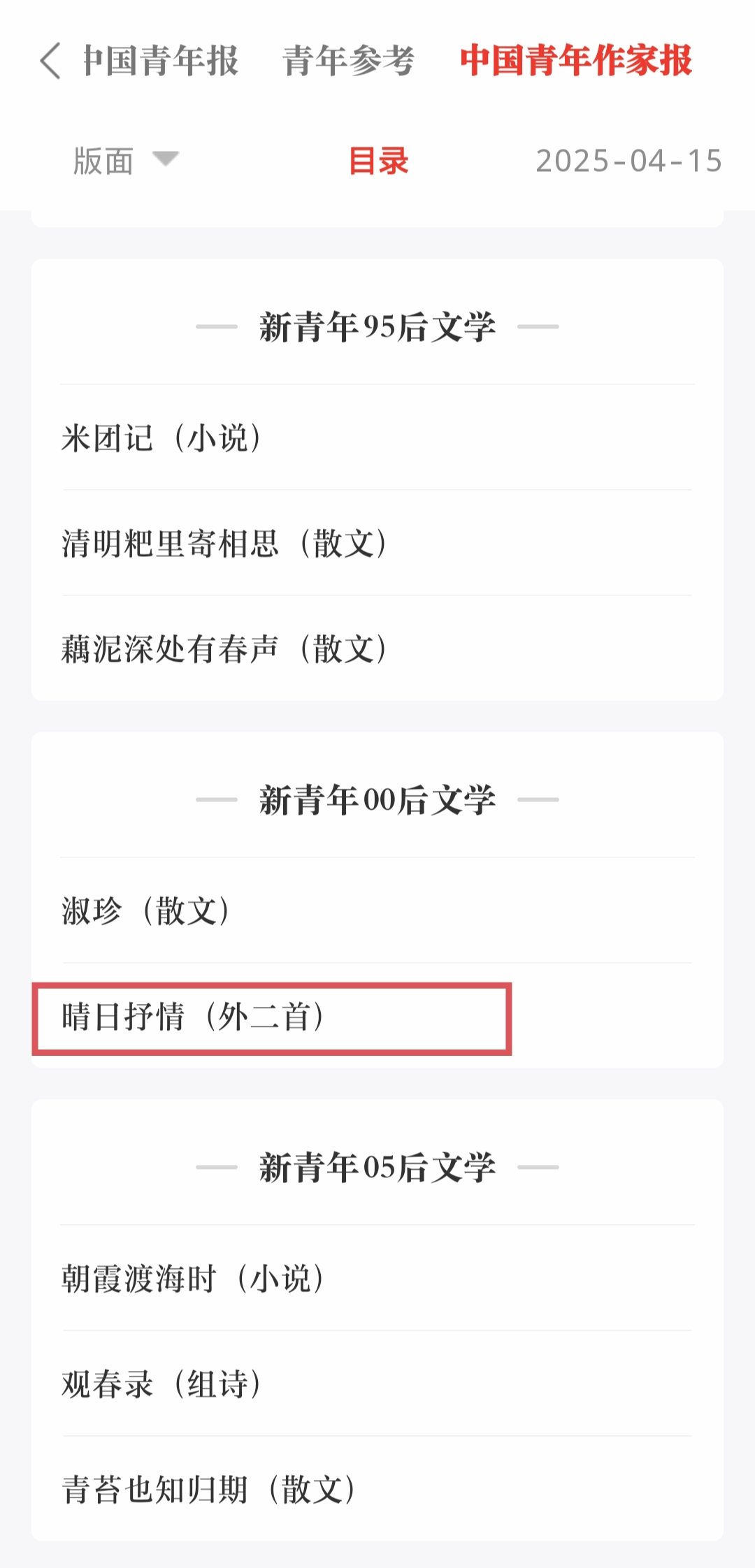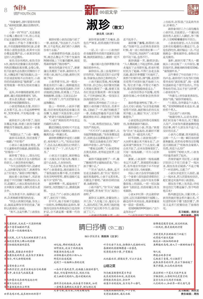 近日,《中国青年作家报》新的一周目录发布,我院学子蒋振炜(笔名楚槐序)的作品《晴日抒情(外二首)》发表其中。