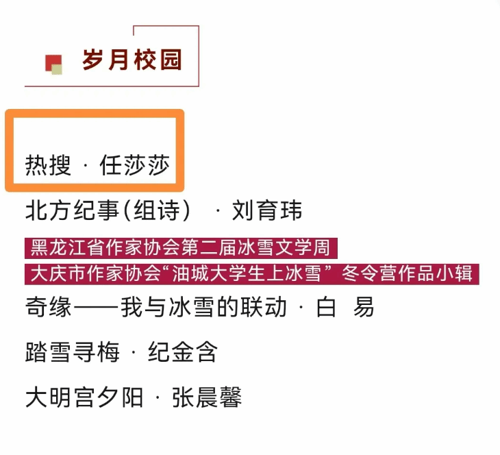 3月26日,《岁月》杂志公众号发布第四期目录,我院学生任莎莎的短篇小说《热搜》名列其中。