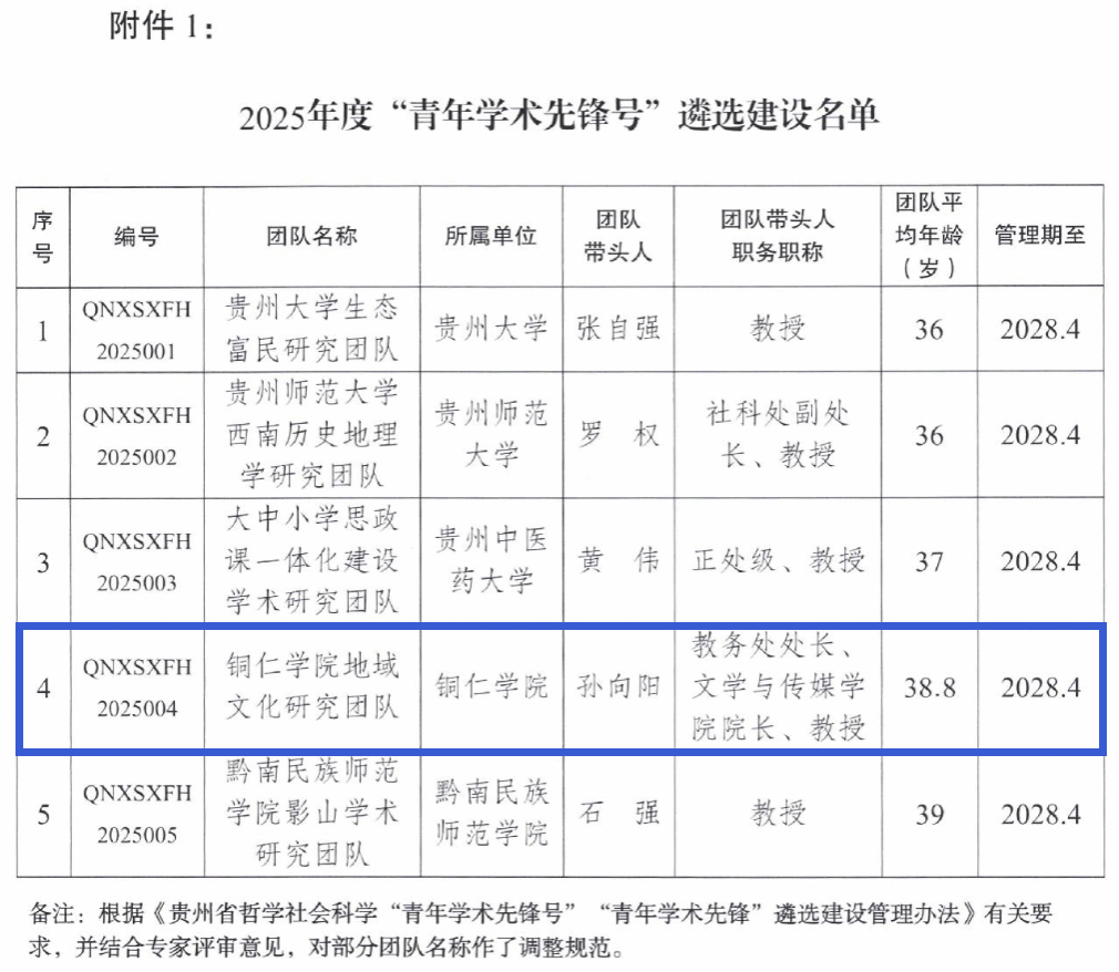 近日,贵州省社会科学联合会、贵州省教育厅公布了2025年度贵州省哲学社会科学“青年学术先锋号”评选结果。经组织申报、专家评审等环节,最终遴选出5个“青年学术先锋号”。由beat365英国官方网站教务处处长、文学与传媒学院院长孙向阳教授领衔的“beat365英国官方网站区域文化研究团队”成功入选,这标志着beat365英国官方网站哲学社会科学平台建设再上新台阶。