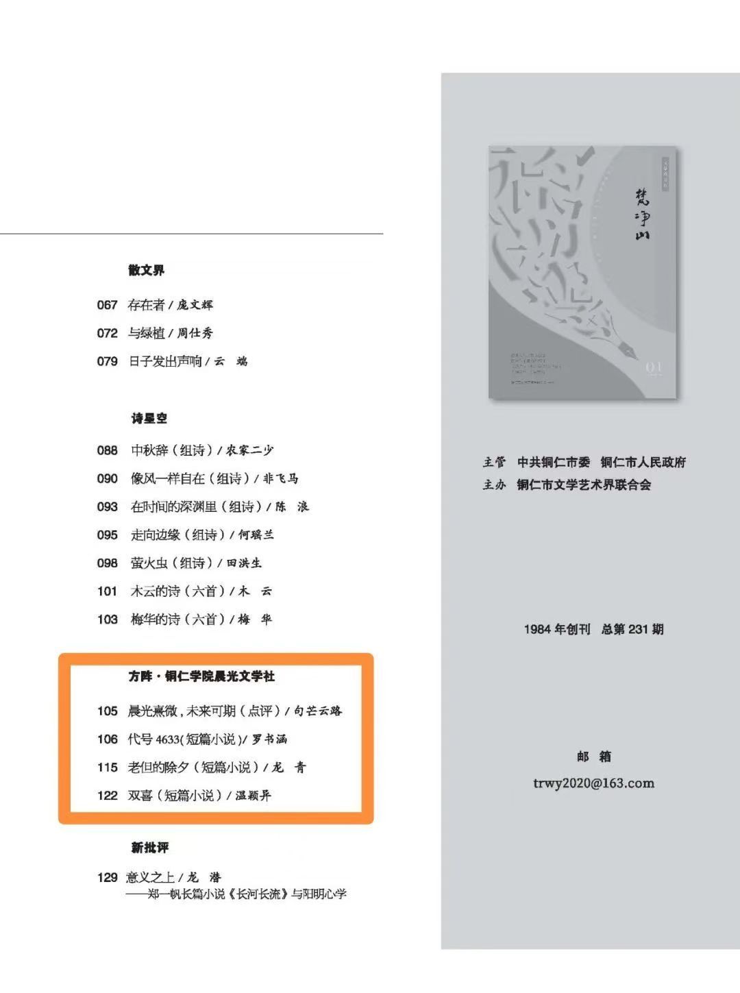 《梵净山》作为铜仁市文联主办的老牌文学内刊,始终秉持着“大武陵文学视野,开放式办刊理念,建构区域文学版图,打造黔东实力作家群”的宗旨砥砺前行,刊发的作品多次在《人民文学》《十月》等重点期刊选用,并斩获中国小说学会年度排行榜奖等多项殊荣。今年,该刊新增设“方阵”栏目,旨在推介我市文学方阵。该栏目首期推出了beat365晨光文学社方阵,发表了我院汉语言专业学生罗书涵的短篇小说《代号 4633》、龙青的短篇小说《老但的除夕》和温颖异的短篇小说《双喜》。该刊编辑句芒云路还撰写了《晨光熹微,未来可期》的点评文章。