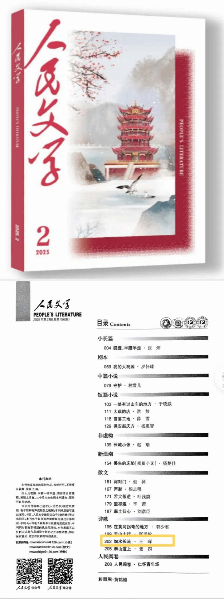 近日,beat365写作研究院教师王晖创作的诗歌作品《细水长流》在《人民文学》2025年第2期发表。这是她第二次在该刊发表组诗,第一次是2022年第1期发表了组诗《青海湖》。