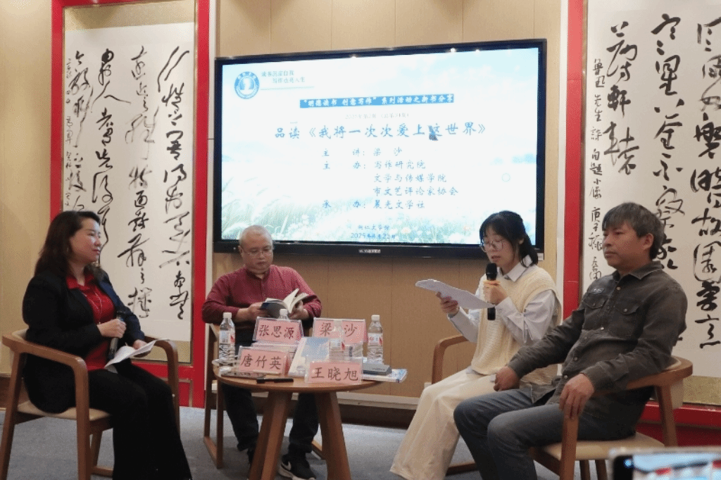 活动中,学生代表进行诗歌朗诵与读书分享,表达对梁沙作品的独特体悟与喜爱,展现出青年学子对文学的热爱与追求。