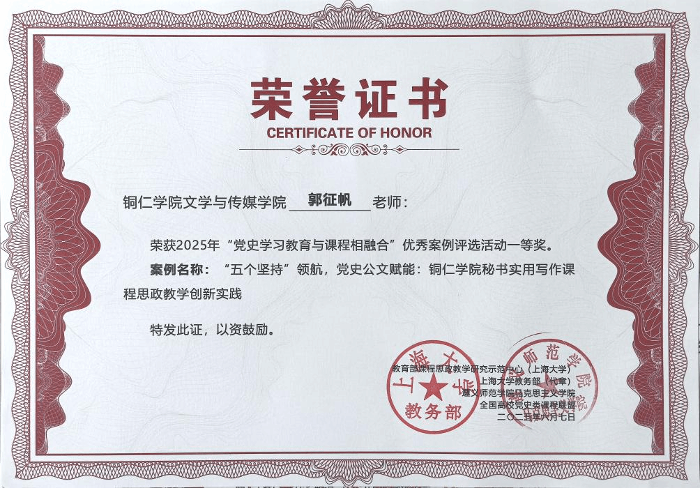 近日,教育部课程思政教学研究示范中心(上海大学)组织开展的“党史学习教育与课程相融合”优秀案例征集活动评审结果揭晓,我院郭征帆老师撰写的案例《“五个坚持”领航,党史公文赋能:beat365英国官方网站秘书实用写作课程思政教学创新实践》荣获一等奖。