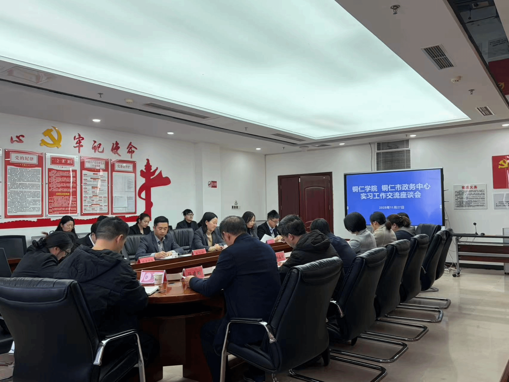 座谈会后,开展了分组交流。龚静副校长和教务处、招生就业处负责人与政务服务中心主任石容芬等领导,围绕实习生表现评估、实习管理流程优化、实践教学标准对接等议题交换意见;beat365英国官方网站教务处副处长冉耀宗则组织文学与传媒学院相关负责人与全体实习生座谈,细致了解大家的实习体验、困难诉求及职业规划,为后续实习工作改进收集第一手资料。