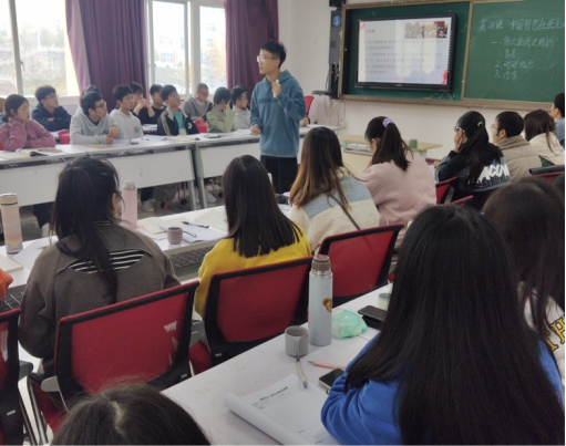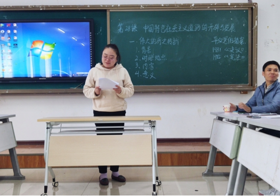 2019级历史学班吴嘉晖试讲了普通高中教材《历史·中外历史纲要(上)》第28课,《中国特色社会主义道路的开辟和发展——伟大的历史转折》。试讲结束后,熊建强作了点评,他认为吴嘉晖同学表述条理清晰、板书整洁、课堂气氛活跃。针对吴嘉晖试讲时出现的一些问题,他也提出了改进的建议。