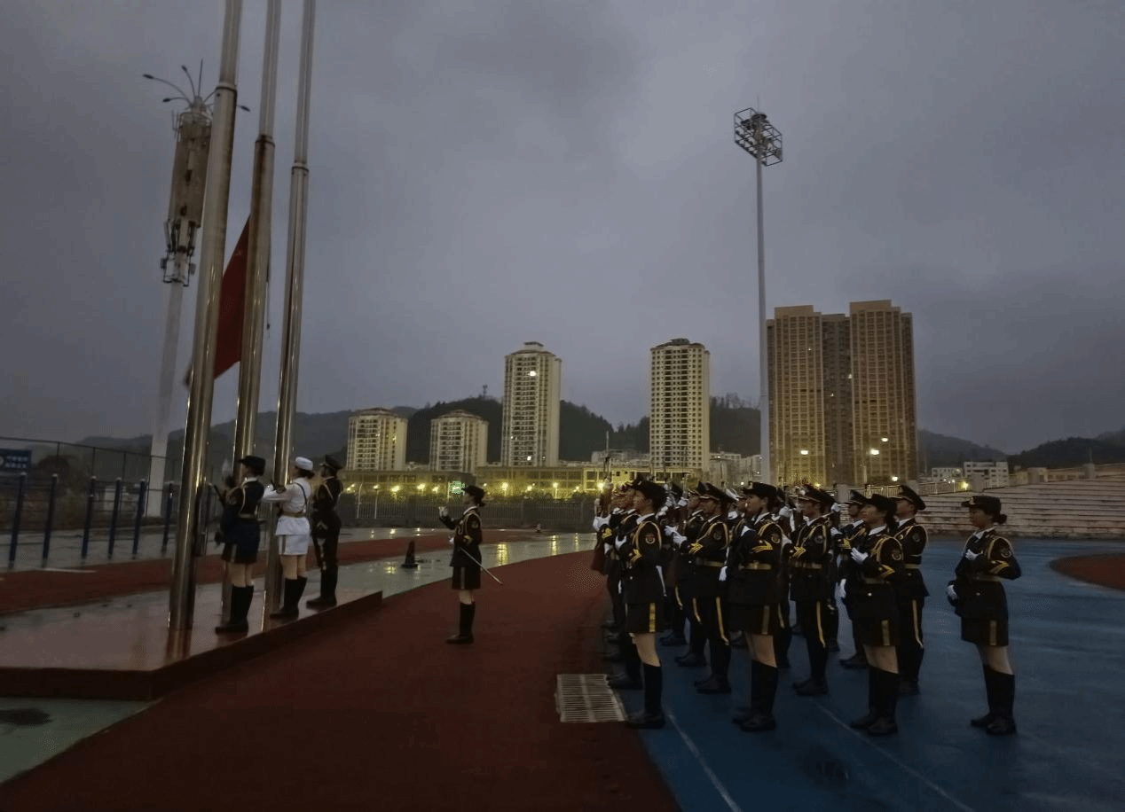 清晨七时,全体同学已在操场整齐集合,升旗仪式准时开始。国旗仪仗队迈着铿锵有力的步伐,护送五星红旗进场,全场师生肃立,面向国旗行注目礼。伴随着国歌《义勇军进行曲》的激昂旋律,五星红旗冉冉升起,迎风飘扬。