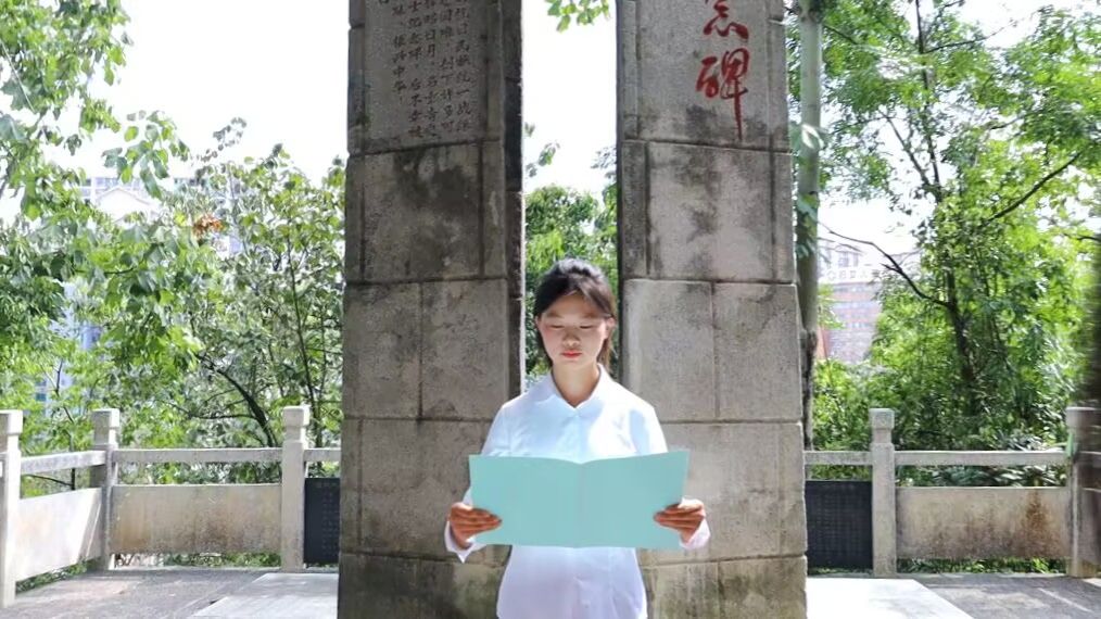 随后,2024级秘书学班薛丽娅同学作为学生代表,在纪念碑前深情朗诵了致敬诗篇《敬献抗日英烈》。诗句饱含对先烈“寸土不让、以身殉国”精神的无限敬仰,也抒发了青年一代“承此遗志,奋力担当”的坚定信念,真挚的情感深深打动了在场的每一位师生。