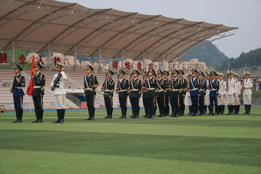 早上7时,全院师生在操场集合完毕,护卫队队员们护送五星红旗进场,全体师生行注目礼、唱国歌,五星红旗冉冉升起