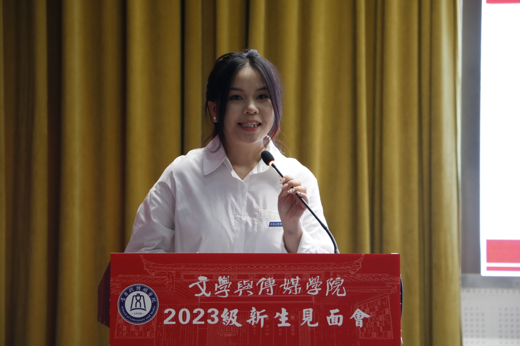 见面会上,还举行了学院徽章佩戴仪式。与会的院领导向新同学佩戴了学院徽章,标志着2023级的新同学已正式成为文学与传媒学院大家庭的一员。