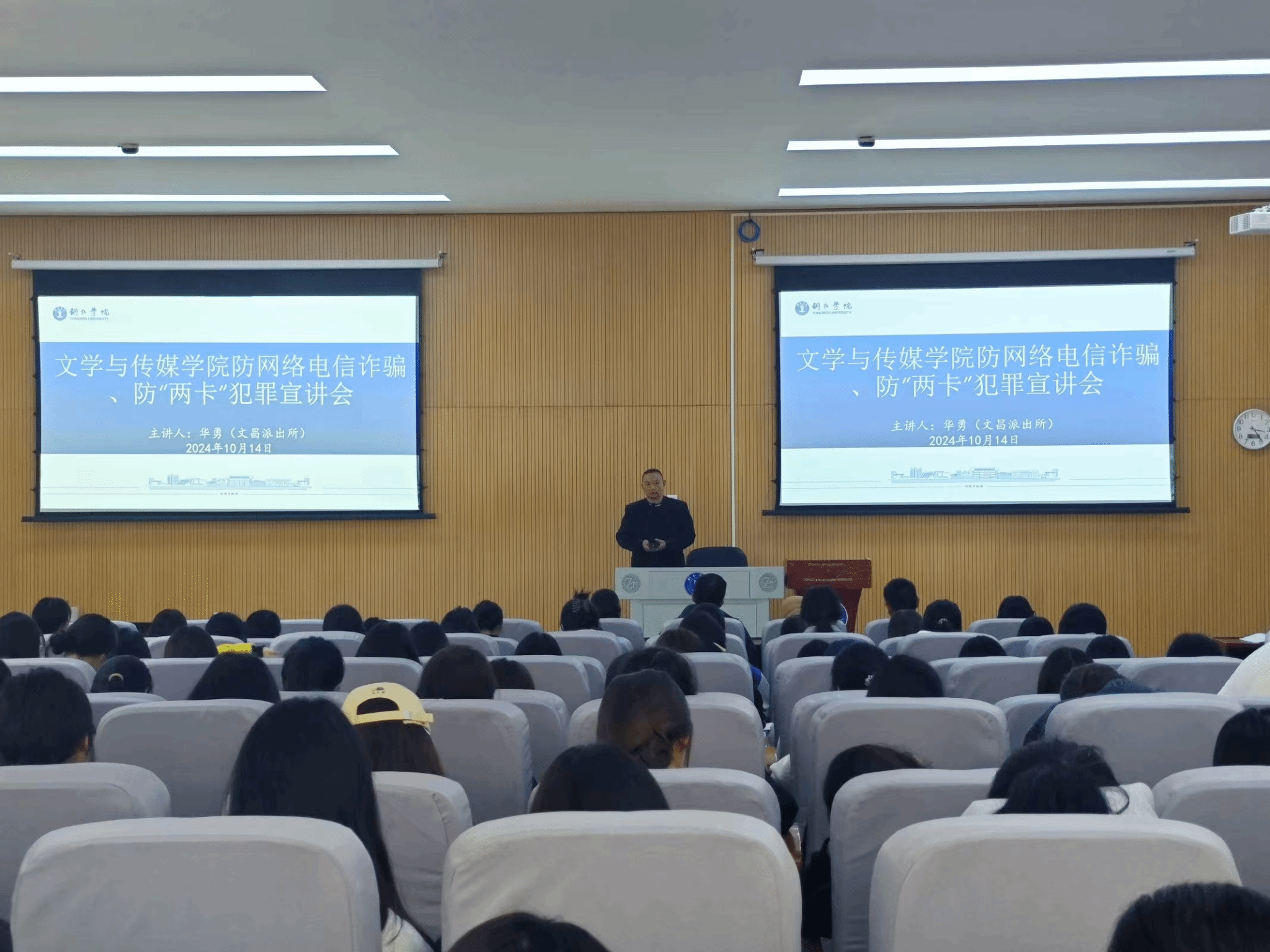 10月14日下午,文学与传媒学院特邀文昌派出所华勇警官在博思楼206教室开展“防网络电信诈骗、防‘两卡’犯罪宣讲会”。2024级全体学生、班主任和其他班级代表参加宣讲会,学校保卫处副处长杨兴国出席了宣讲会,宣讲会由副院长张建刚主持。