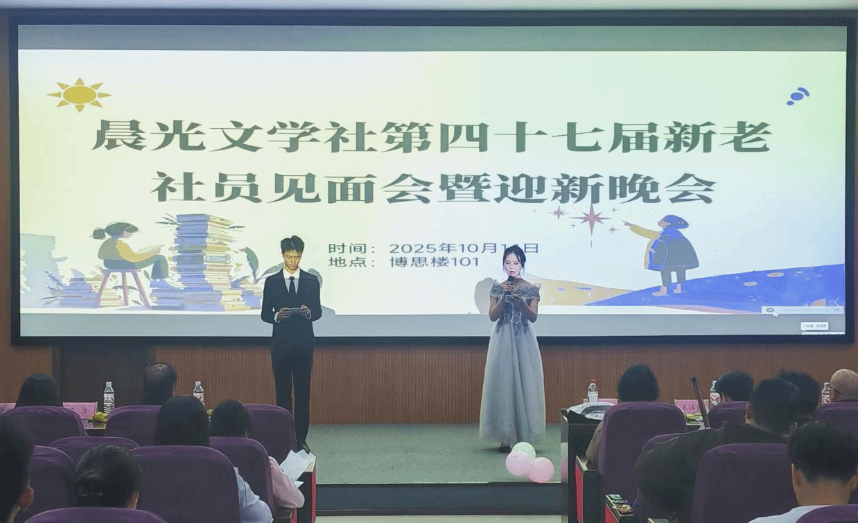 随着2025级招新工作圆满结束,为促进新老社员交流、帮助新成员快速融入集体,10月14日晚,晨光文学社在博思楼101教室举行了第四十七届新老社员见面会暨迎新晚会。文学与传媒学院副院长张建刚、写作研究中心主任庄鸿文,以及社团指导老师王晖、晏武芳、王棋君等嘉宾,与晨光文学社新老社员共同参与了本次活动。 教室里随处可见热情的招呼与亲切的交流,师生齐聚的热闹场景,让今天的文学之夜温暖美好。