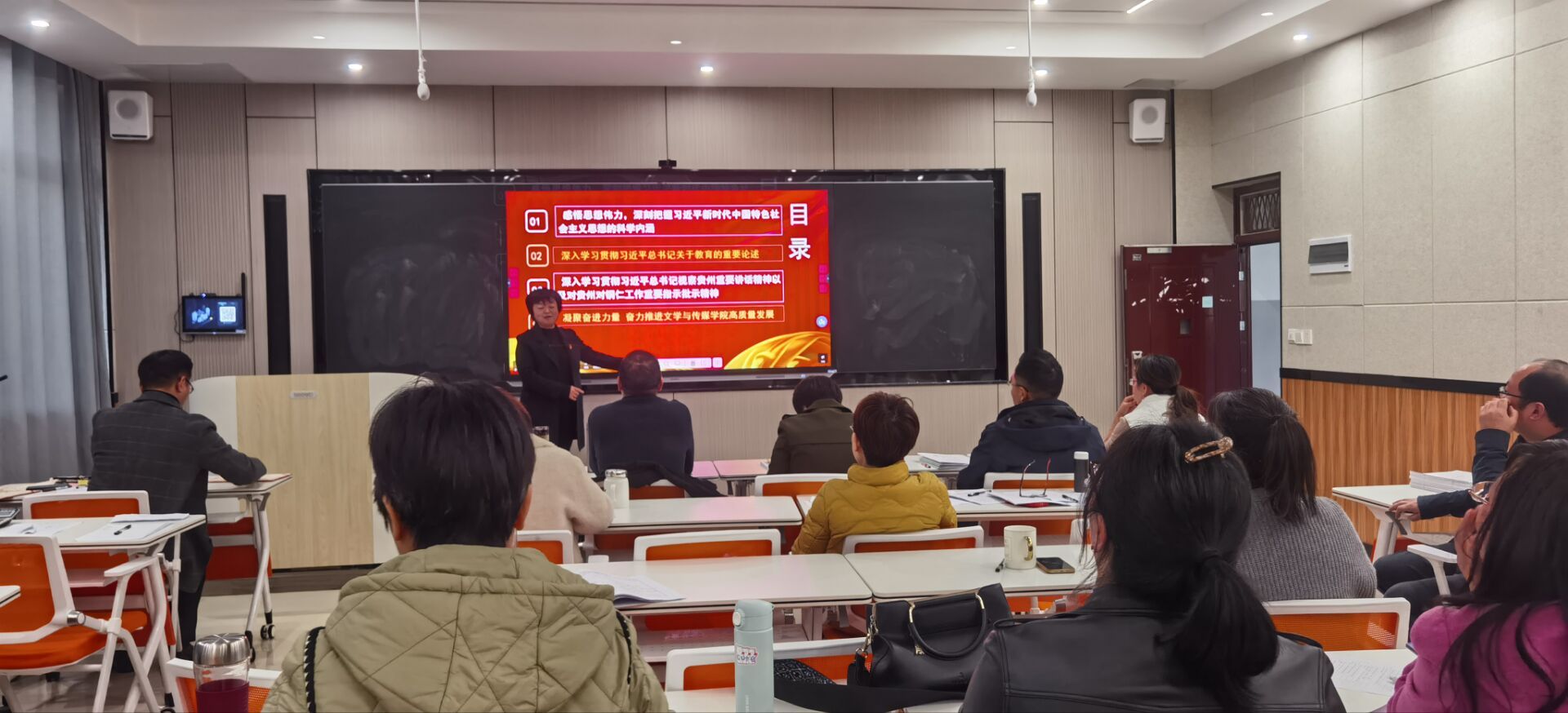 蒋小红指出,习近平新时代中国特色社会主义思想推动马克思主义中国化时代化实现了重大发展,指引中国特色社会主义进入了新时代,深刻回答了新时代坚持和发展什么样的中国特色社会主义、怎样坚持和发展中国特色社会主义,建设什么样的社会主义现代化强国、怎样建设社会主义现代化强国,建设什么样的长期执政的马克思主义政党、怎样建设长期执政的马克思主义政党等重大时代课题,从理论与实践的结合上科学回答了中国之问、世界之问、人民之问、时代之问。习近平总书记立足全面建设社会主义现代化国家、全面推进中华民族伟大复兴战略高度,紧密围绕“培养什么人、怎样培养人、为谁培养人”这一教育的根本问题,发表系列重要讲话、作出系列重要指示批示、给师生群体回信等,提出许多新理念新思想新观点,为教育事业发展提供了根本遵循。“九个坚持”概括了习近平总书记关于教育的重要论述的核心思想和精髓要义。我们要做到内化于心、外化于行。习近平总书记对贵州工作的重要指示精神,是习近平新时代中国特色社会主义思想在贵州的具体化,是推动贵州高质量发展和现代化建设的总遵循、总纲领、总指针,需要系统学、反复学、深入学,深刻领会、准确把握、全面落实。习近平总书记对高等教育事业发展高度重视,强调,“建设教育强国,龙头是高等教育”。文学与传媒学现共有汉语言文学、秘书学、网络与新媒体三个本科专业,要办好文学与传媒学院关键在党,关键在人,关键在各级领导班子、领导干部和广大党员团结起来,凝聚奋进力量,共同为教育事业作出应有的贡献。