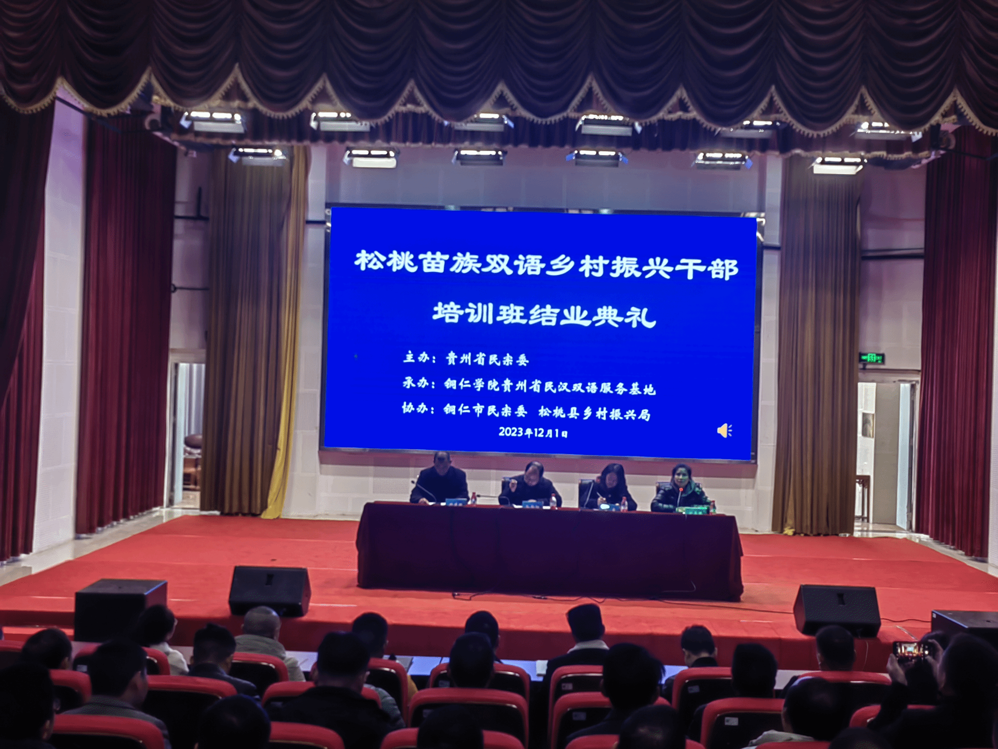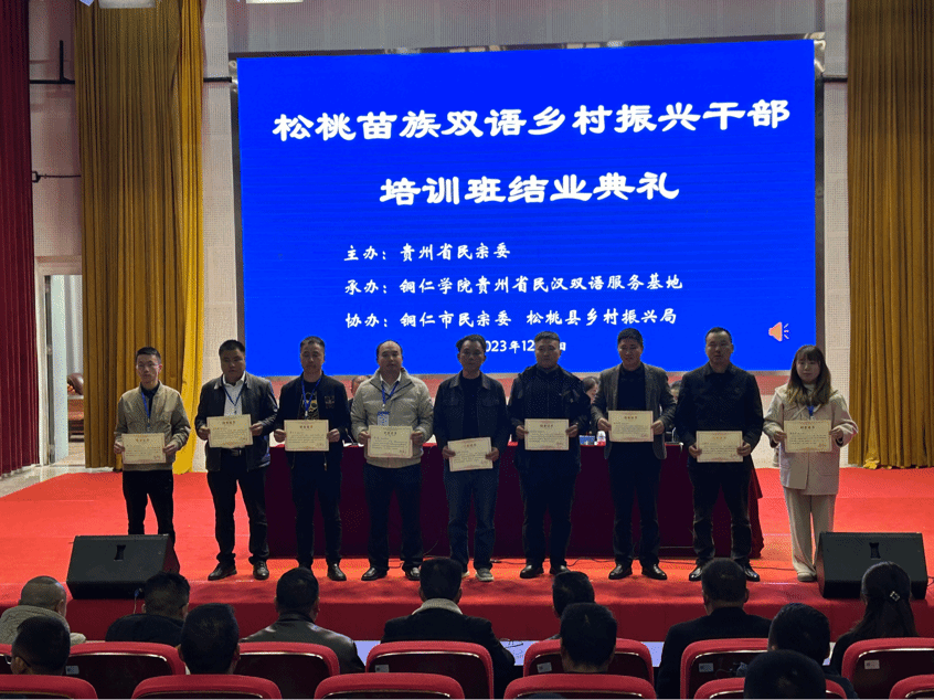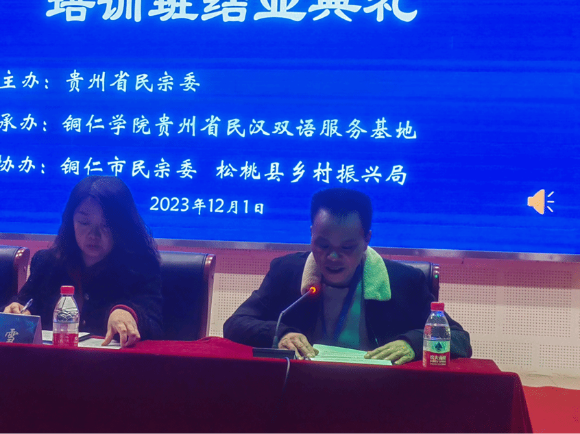 2023年12月1日上午11点,在人文生态馆举行了松桃苗族双语乡村振兴干部培训班结业典礼。文学与传媒学院党委书记、院长孙向阳,党委副书记杨雪,副院长张建刚出席本次结业典礼。结业典礼由此次培训班班主任刘禹珉老师主持。培训班的全体学员参加了结业典礼。