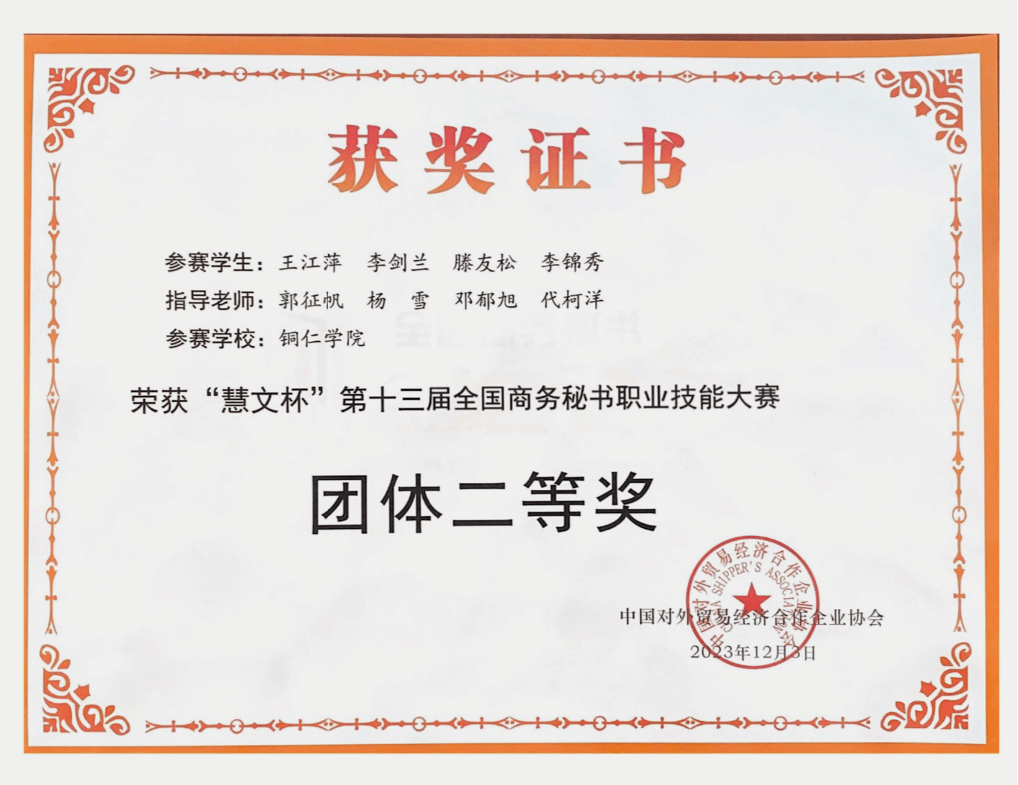 “本届大赛是三年疫情期间三届线上竞赛后,首次恢复现场竞赛。自组队备赛以来,同学们认真复习、排练、预演,经过大赛实践,取得了较好成绩。比赛期间,1队李锦秀同学的奶奶不幸病故,但是她克服困难、强忍悲痛,坚持到比赛结束。她这种胸怀大局,不计个人的行为,彰显了秘书学专业学生良好的职业素养。感谢所有关心和支持我们的师友,我们将认真总结,不断奋进,努力拼搏,积极践行‘以赛促教,以赛促学,以赛促建,赛教结合’的宗旨,着力推动秘书学专业更高质量发展。”郭征帆说。