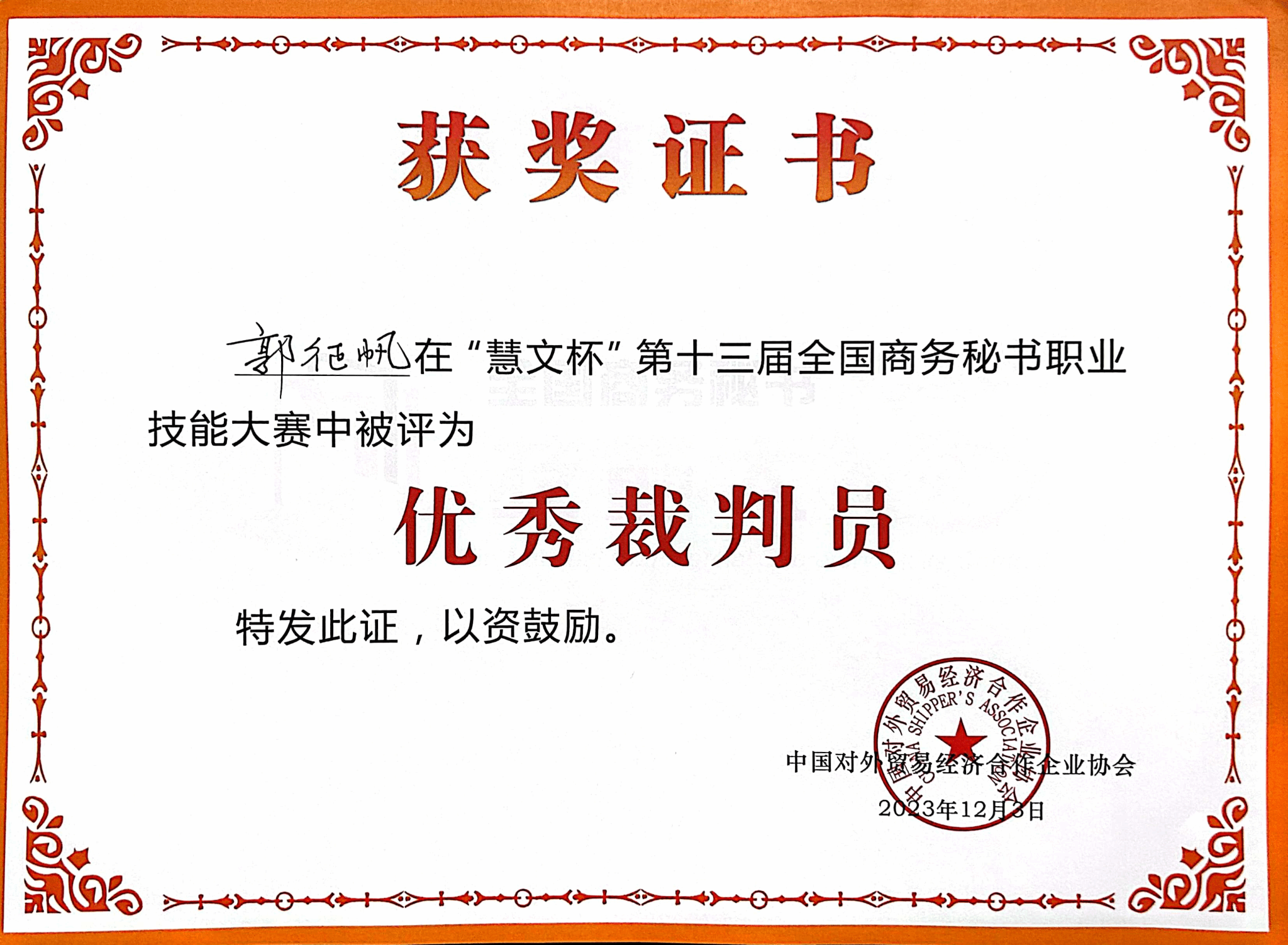 优秀裁判员证书