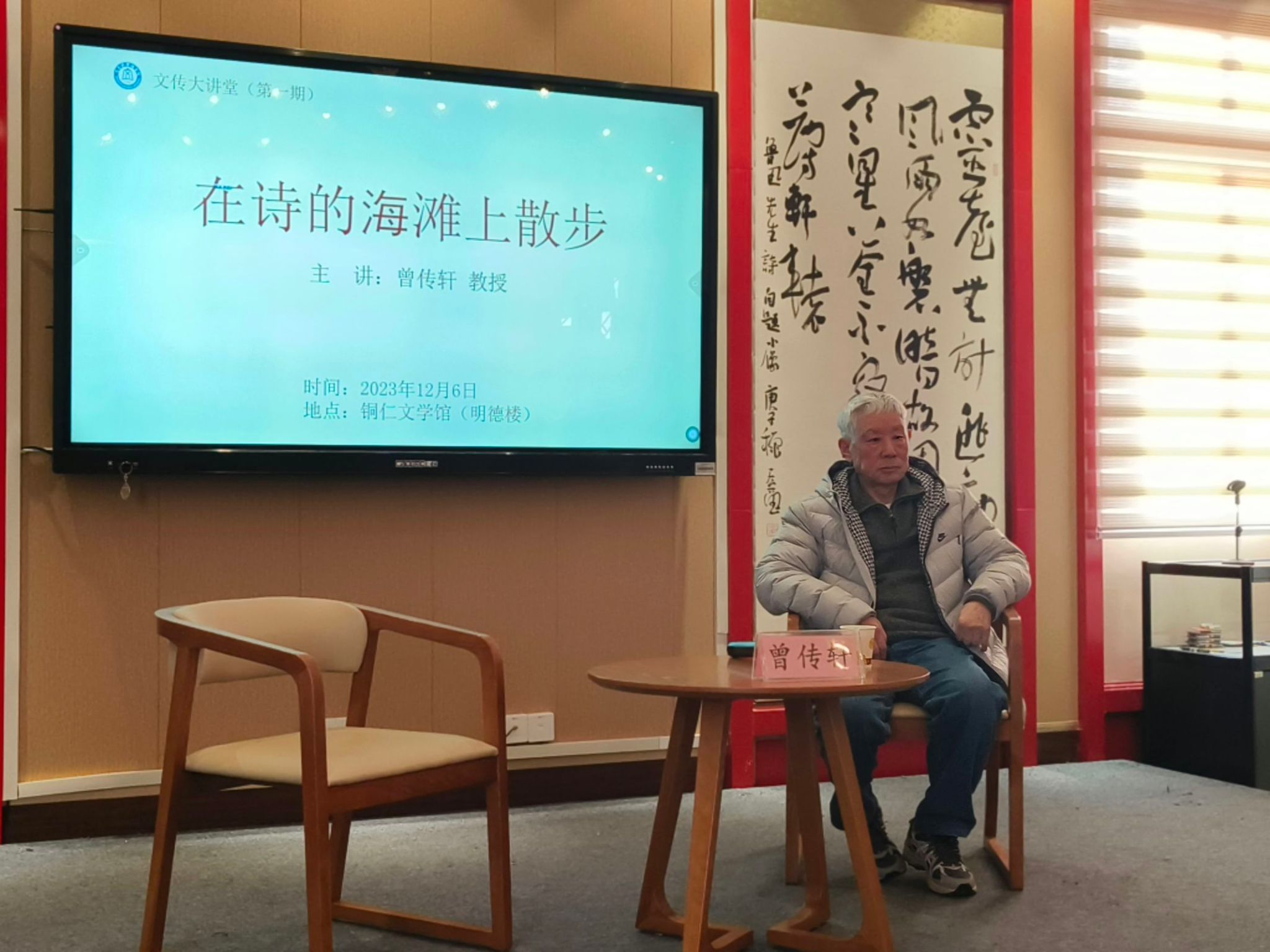 曾老师以《在诗的海滩上散步》为题,采用文学漫谈的形式,以学贯中西、融通古今的文化视野,结合具体文学作品分享了贵州山歌、古典文学、苏联文学和美国民间歌谣中表达的诗意化的语言,并结合自身的读诗经历与同学们分享读诗的感悟。