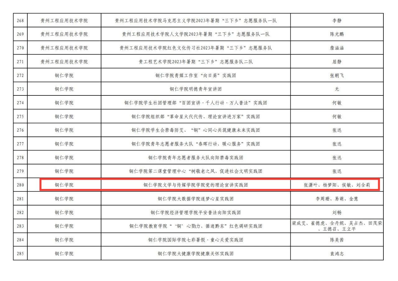 12月23日,贵州团省委学校部公示了2023年贵州省大中专学生志愿者暑期文化科技卫生“三下乡”社会实践活动评选结果。文学与传媒学院团总支荣获2023年贵州省“三下乡”社会实践优秀组织单位、我院21级学生钟贵平、田茂茂、王静静、龙姗姗、杨报、陈钗、欧兰菲、贺熠暄8位同学获2023年贵州省“三下乡”社会实践优秀个人、我院“beat365英国官方网站文学与传媒学院党的理论宣讲实践团”团队获2023年贵州省“三下乡”社会实践优秀团队。