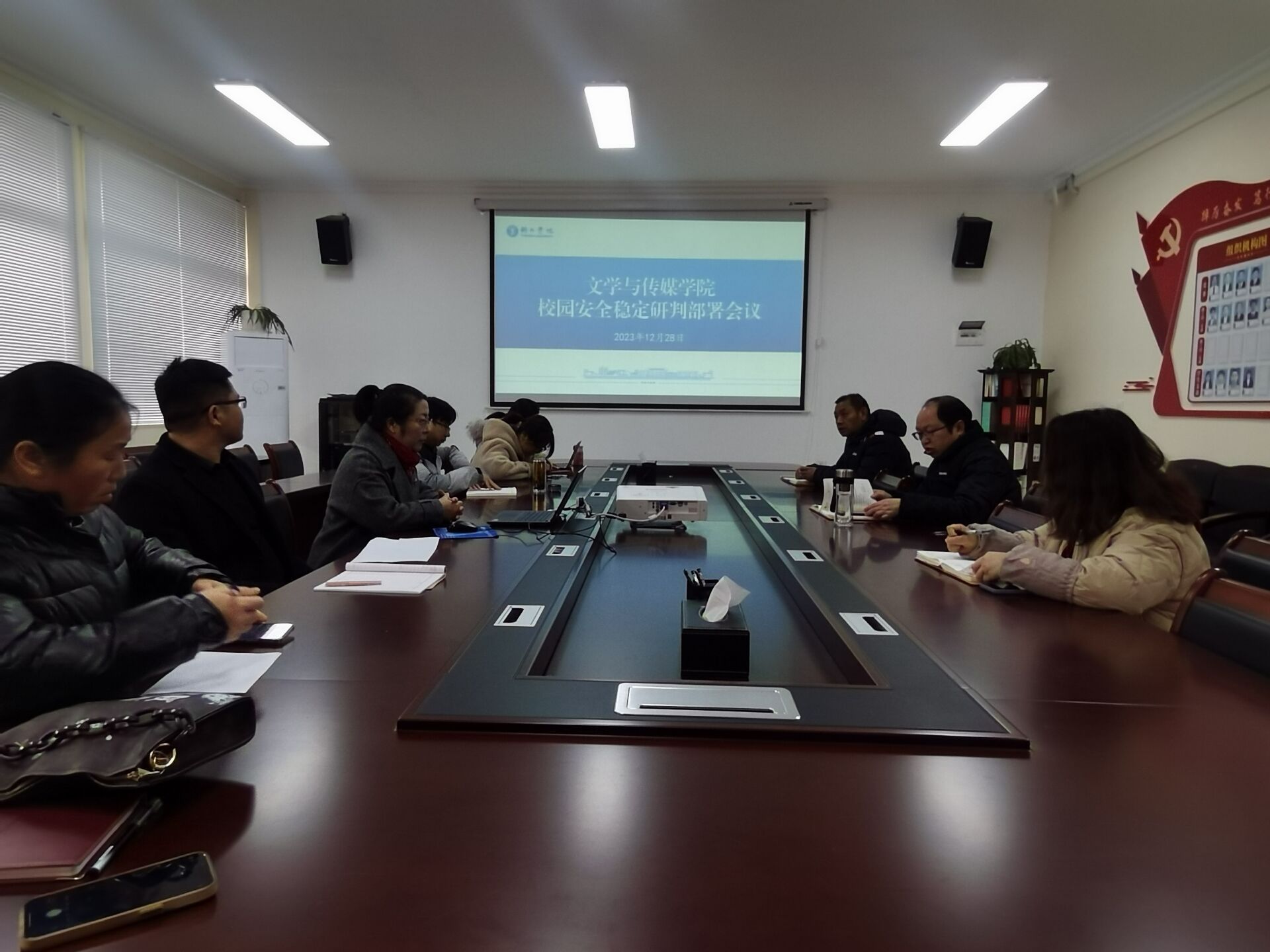 12月28日上午,文学与传媒学院在院会议室召开寒假前校园安全稳定研判部署会议。院党委书记、院长孙向阳,院党委副书记杨雪,副院长张建刚出席会议,院全体行政人员参加会议。会议由张建刚主持。